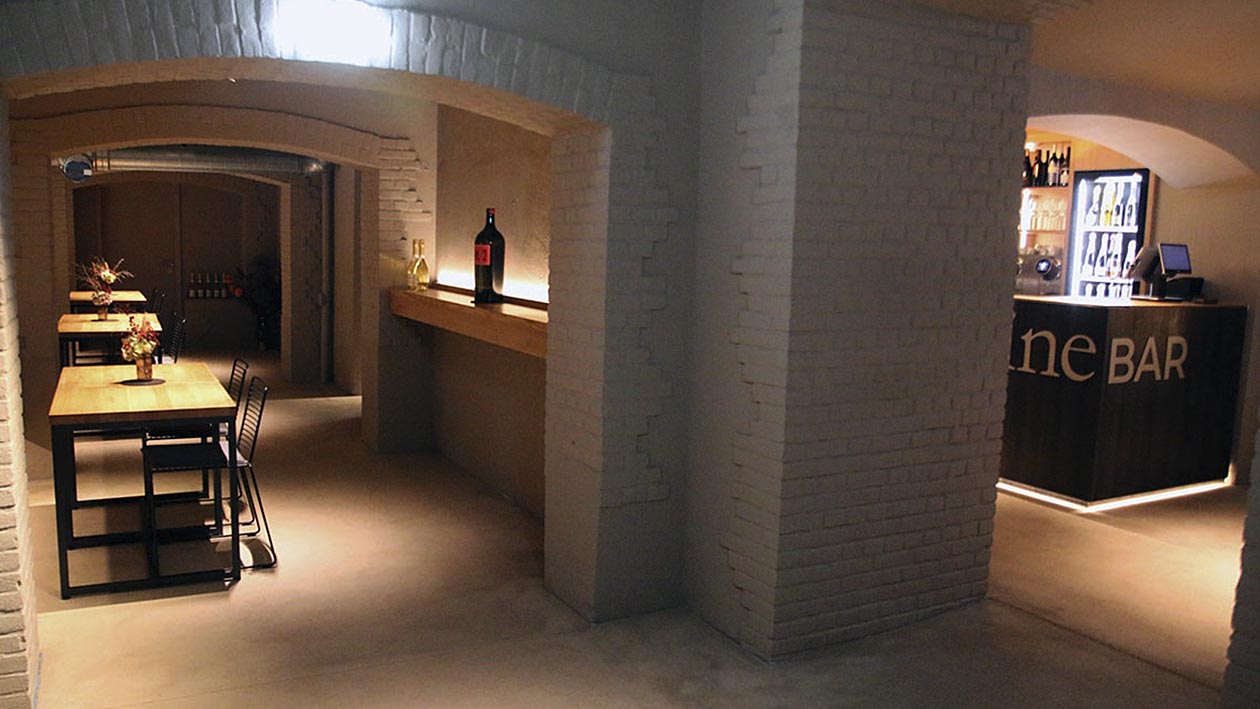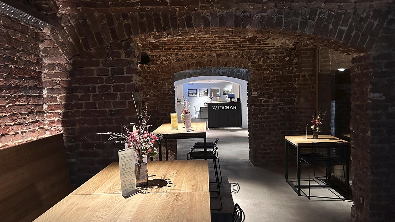Schon der Weg in die wineBAR hat etwas Entdeckendes. Durch eine beinahe versteckt liegende Tür an der Seite des Hauses Erholung gelangt man in einen Raum, der sofort seinen eigenen Charme entfaltet. Bei der Renovierung wurde das alte rote Backsteinmauerwerk freigelegt, das im hinteren Bereich in hell verputzte Wände übergeht. Dieser Kontrast aus historischer Substanz und moderner Gestaltung setzt sich in den klaren Holzmöbeln und dem bewusst schummrig gehaltenen Lichtkonzept fort. Das Ergebnis: eine warme, einladende Atmosphäre, die zum Verweilen animiert. Große Fensterfronten auf der rechten Seite der Bar erlauben zudem einen ersten Blick in die den Mitgliedern vorbehaltene wineBANK selbst. Die sichtbaren Weintresore geben einen ersten Eindruck von dem, was in den Gewölben unter dem Haus Erholung entstanden ist.