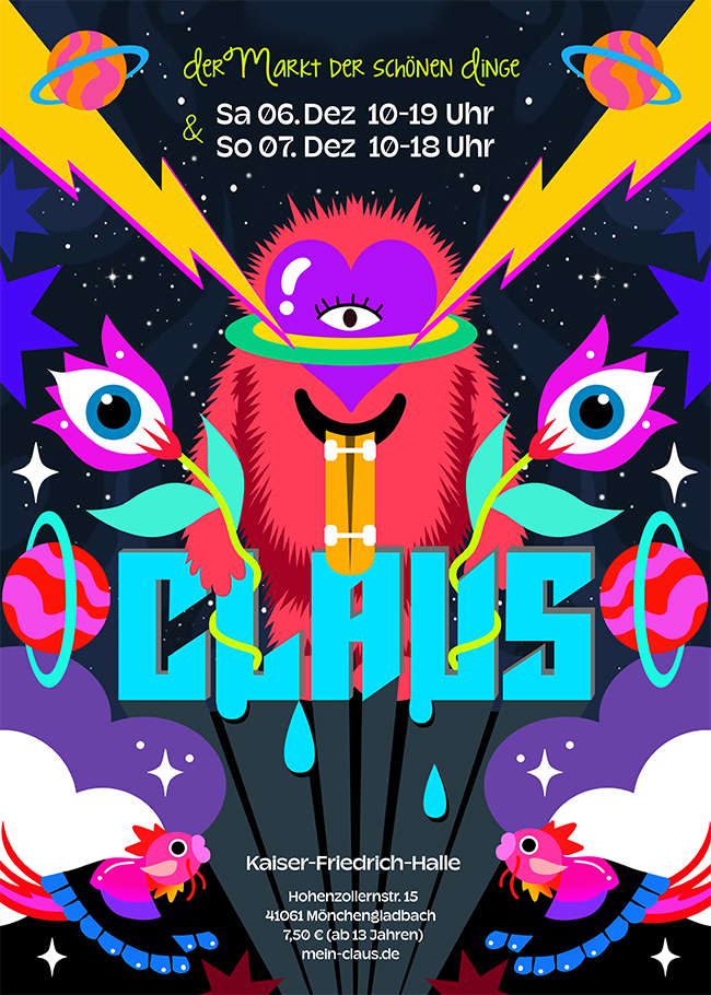 Wer schon einmal auf dem einen oder anderen Claus-Markt war, weiß, dass sich Veranstalterin Myriam Topel und ihr Team immer wieder Neues einfallen lassen, um auch visuell zu begeistern. Stand der Markt im letzten Jahr noch unter dem Motto „Welcome to the Jungle“, blickt man dieses Jahr in die Sterne und lässt sich durch die Dekoelemente „in eine Welt voller Verrücktheiten und Träume jenseits unseres Planeten entführen“, wie Myriam Topel es selber formuliert.